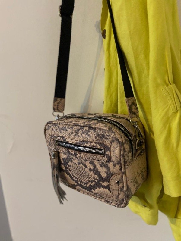 Bandolera Selene Reptil Nude, chica pero cabedora. Con dos cierres, para que puedas separar llaves de billetera, y encontrar rápido lo que necesitas.