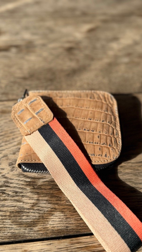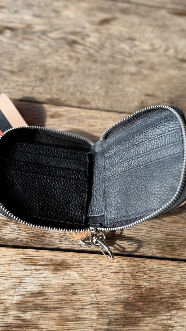 Con espacio para 6 tarjetas, dos compartimentos para billetes y mosquetón con correa sublimada.
