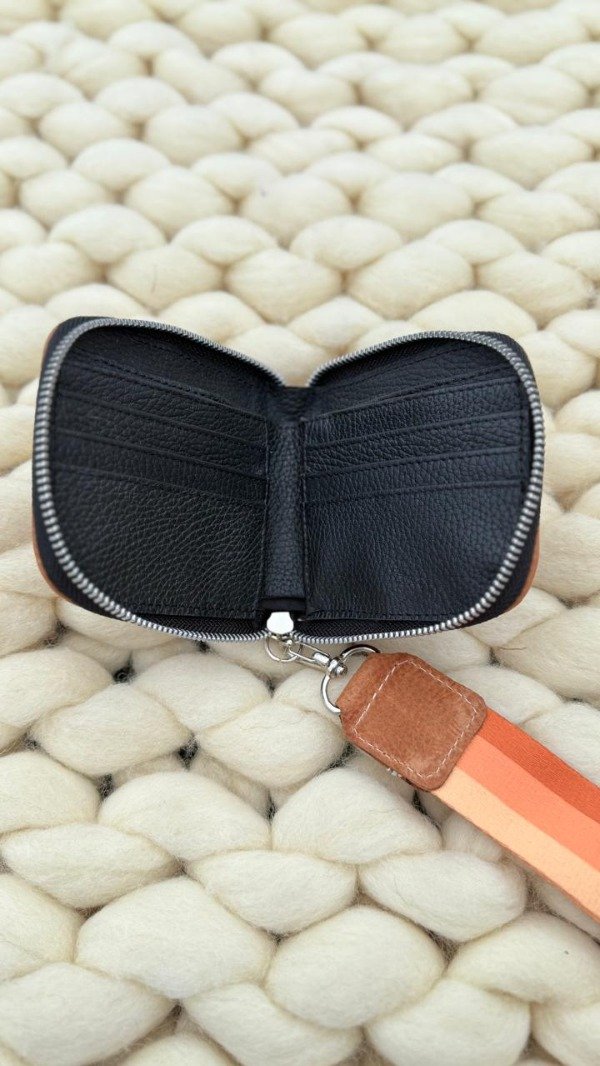 Con espacio para 6 tarjetas, dos compartimentos para billetes y mosquetón con correa sublimada.